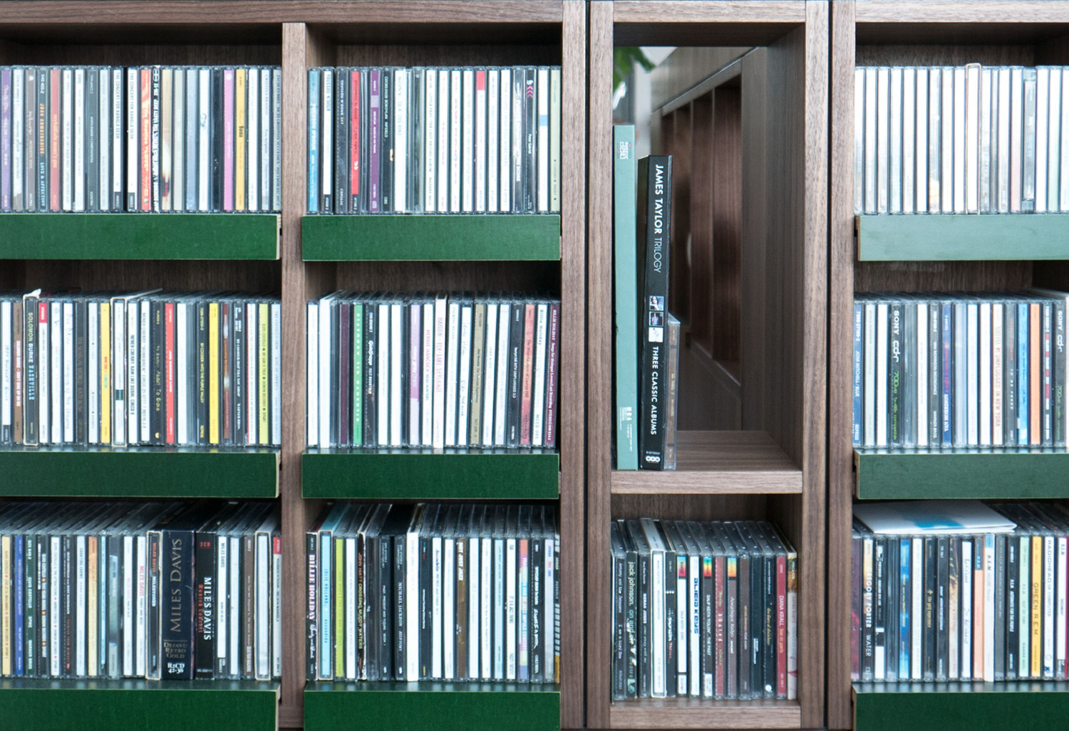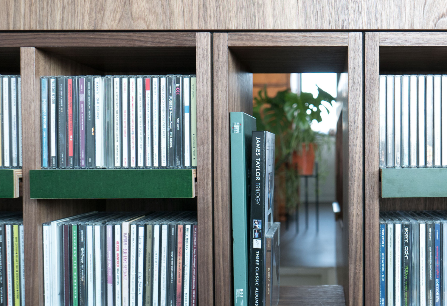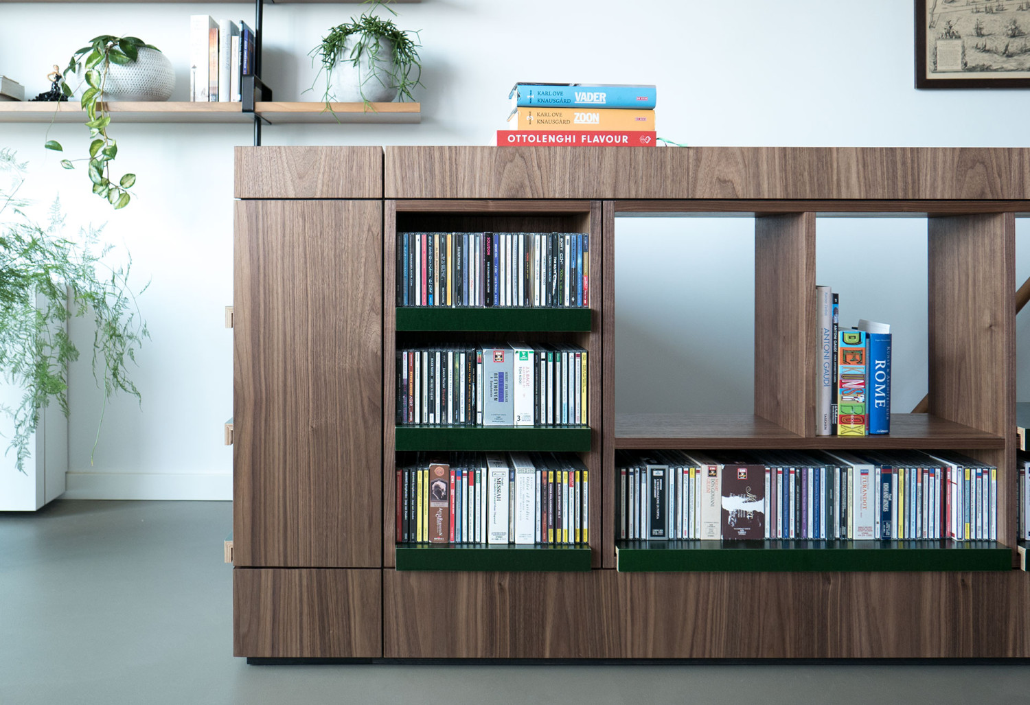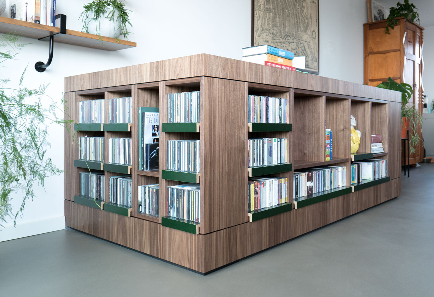 De opdrachtgever wilde graag een meubel om het trapgat die deels transparant was en waar de CD collectie in gezet kon worden.