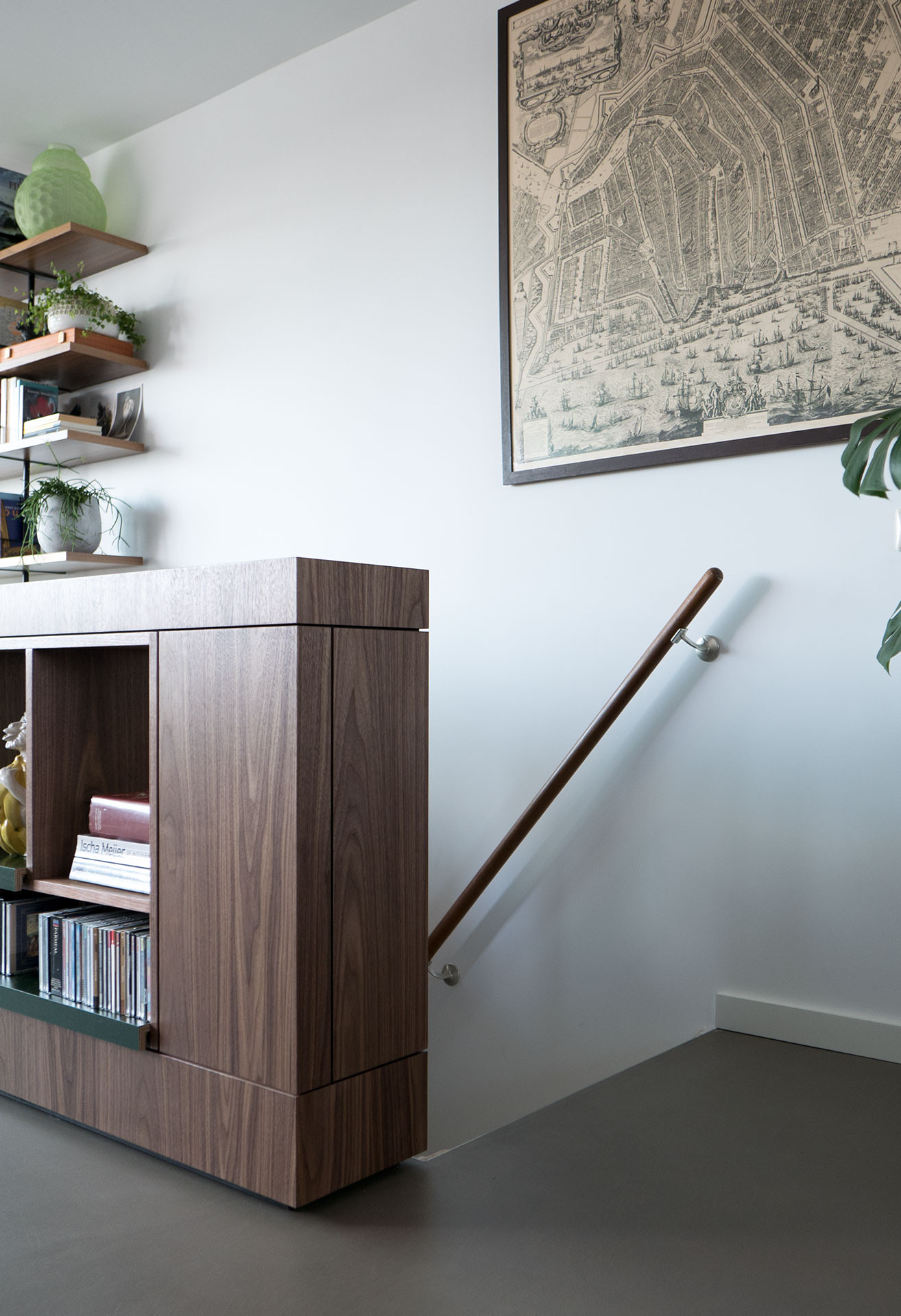 Het meubel is opgedeeld in meerdere vlakken, zo ontstaan er fijne verhoudingen die bij de ruimte passen. De tekening van het noten loopt verticaal waardoor het meubel haaks op de vloer komt te staan en daardoor een sterk karakter uitstraalt.