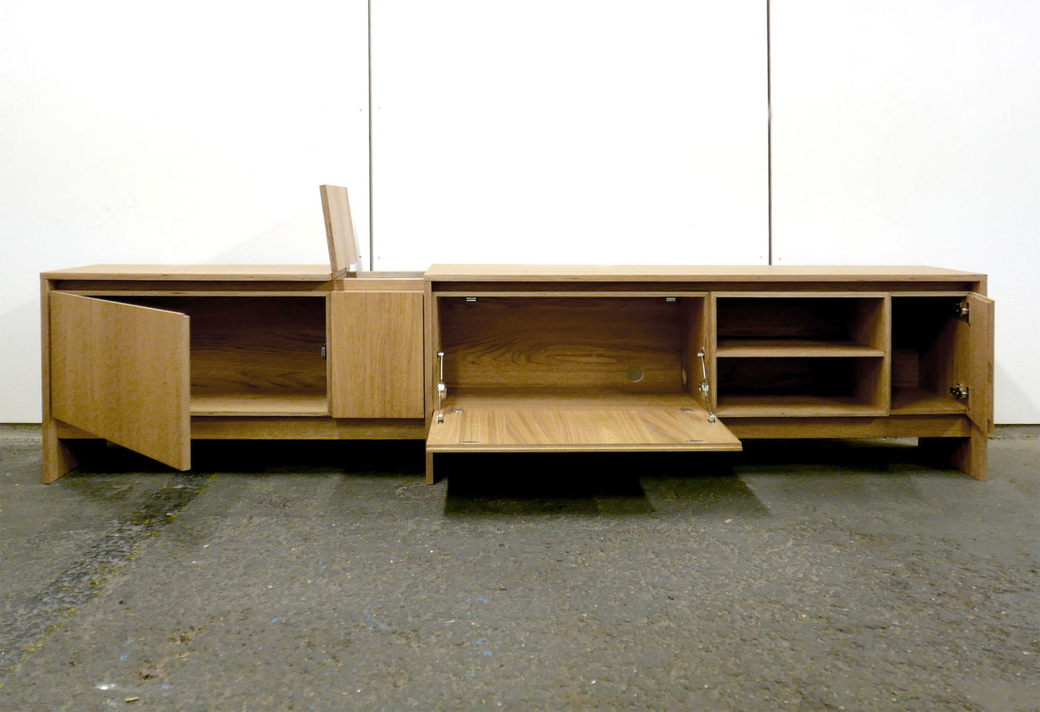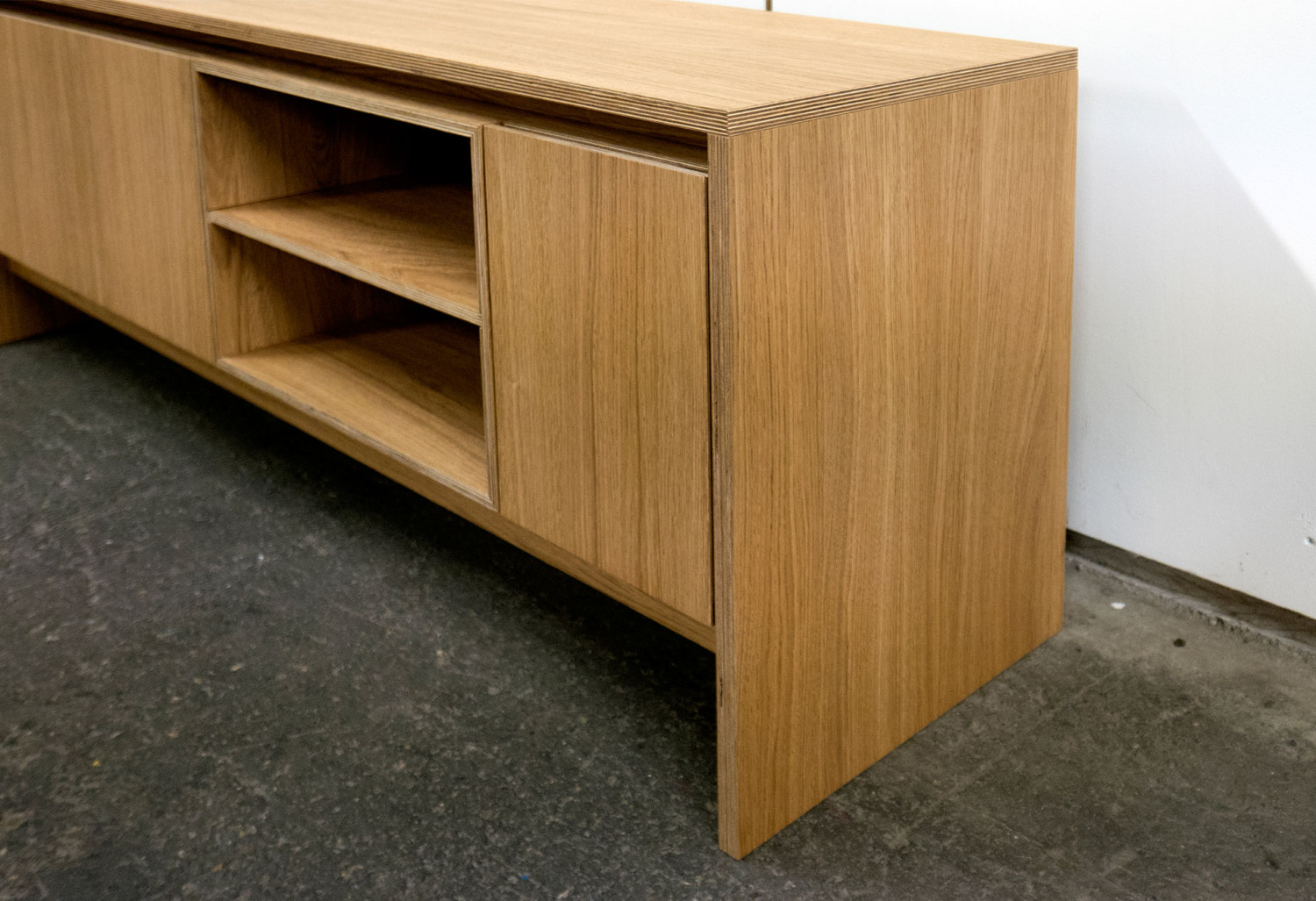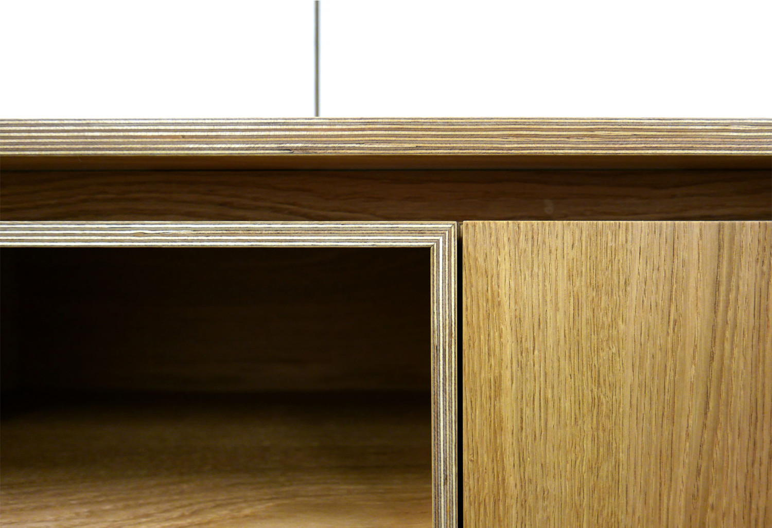 De wensen van de klant zijn vertaald naar een functioneel en tijdsloos meubel. Bij dit dressoir/ tv-meubel, draait elk paneel anders open waardoor deze kast verrassend en uniek wordt. Het meubel is gemaakt van een Berken multiplex met een Eiken fineer laag in olie.