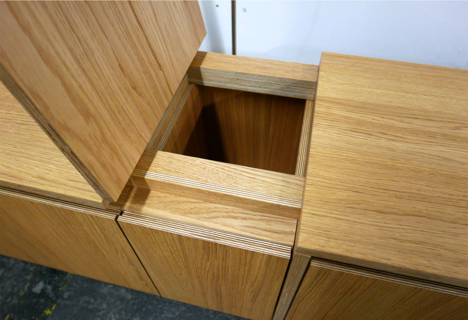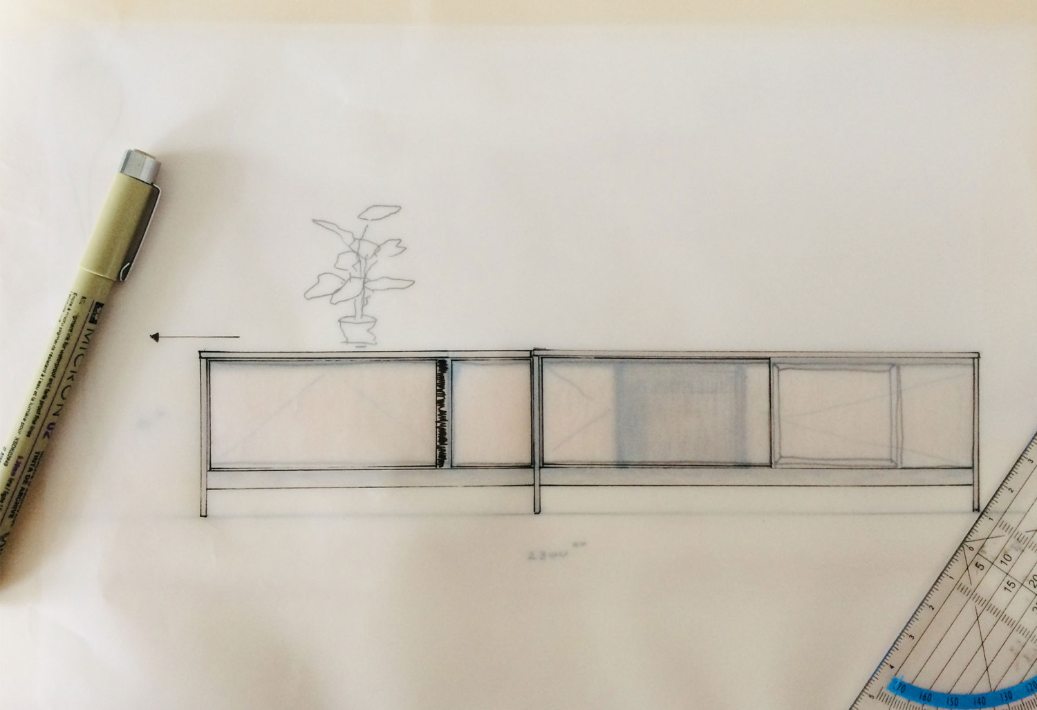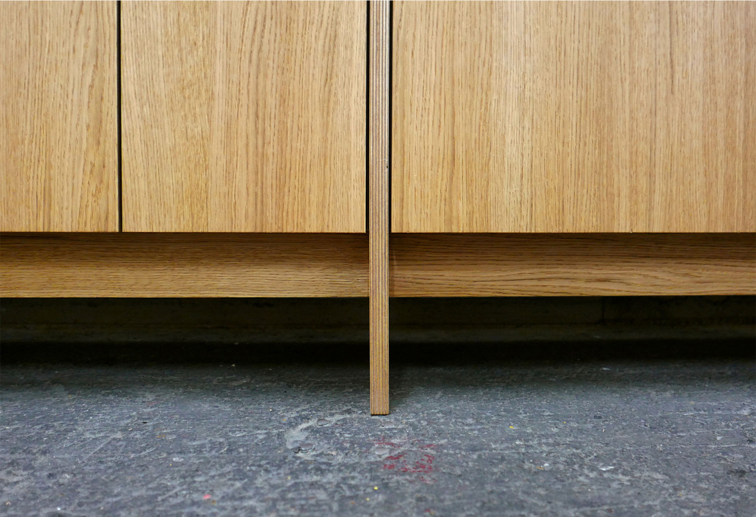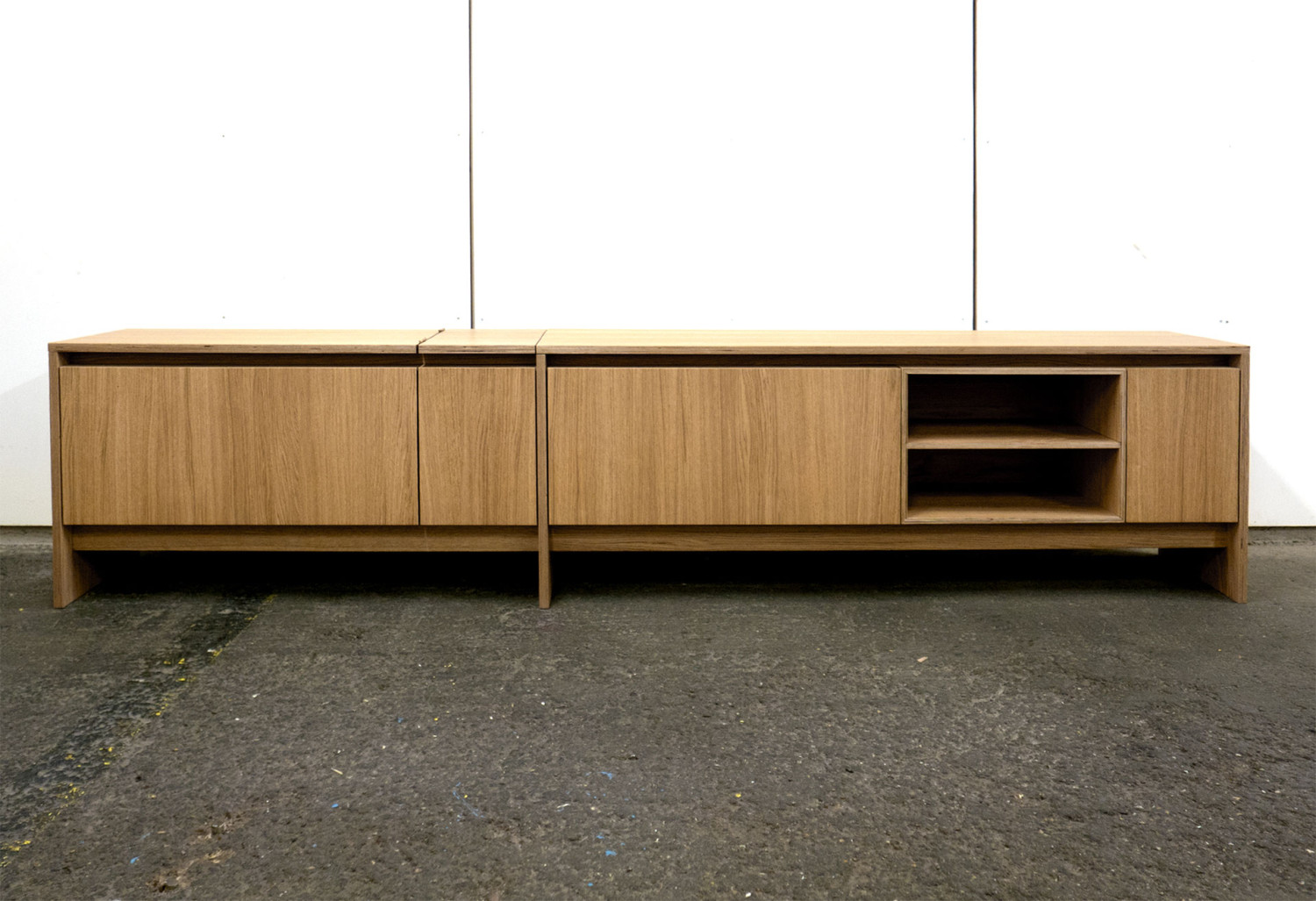 De wensen van de klant zijn vertaald naar een functioneel en tijdsloos meubel. Bij dit dressoir/ tv-meubel, draait elk paneel anders open waardoor deze kast verrassend en uniek wordt. Het meubel is gemaakt van een Berken multiplex met een Eiken fineer laag in olie.