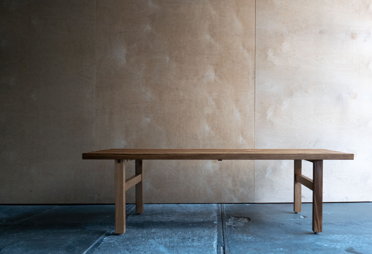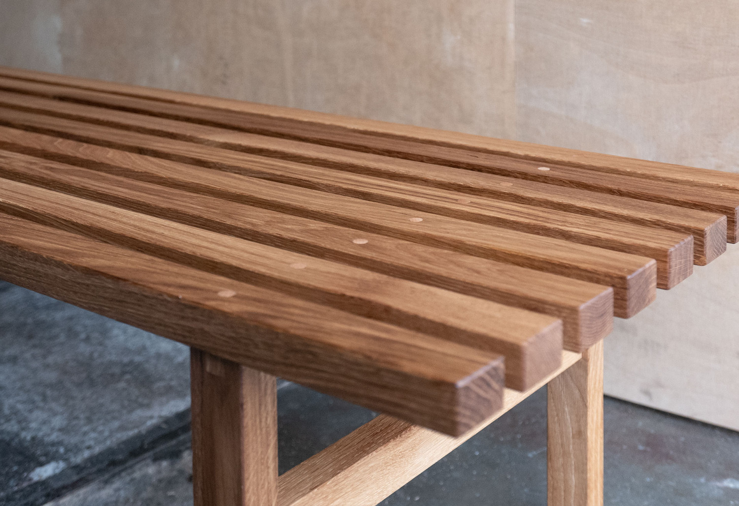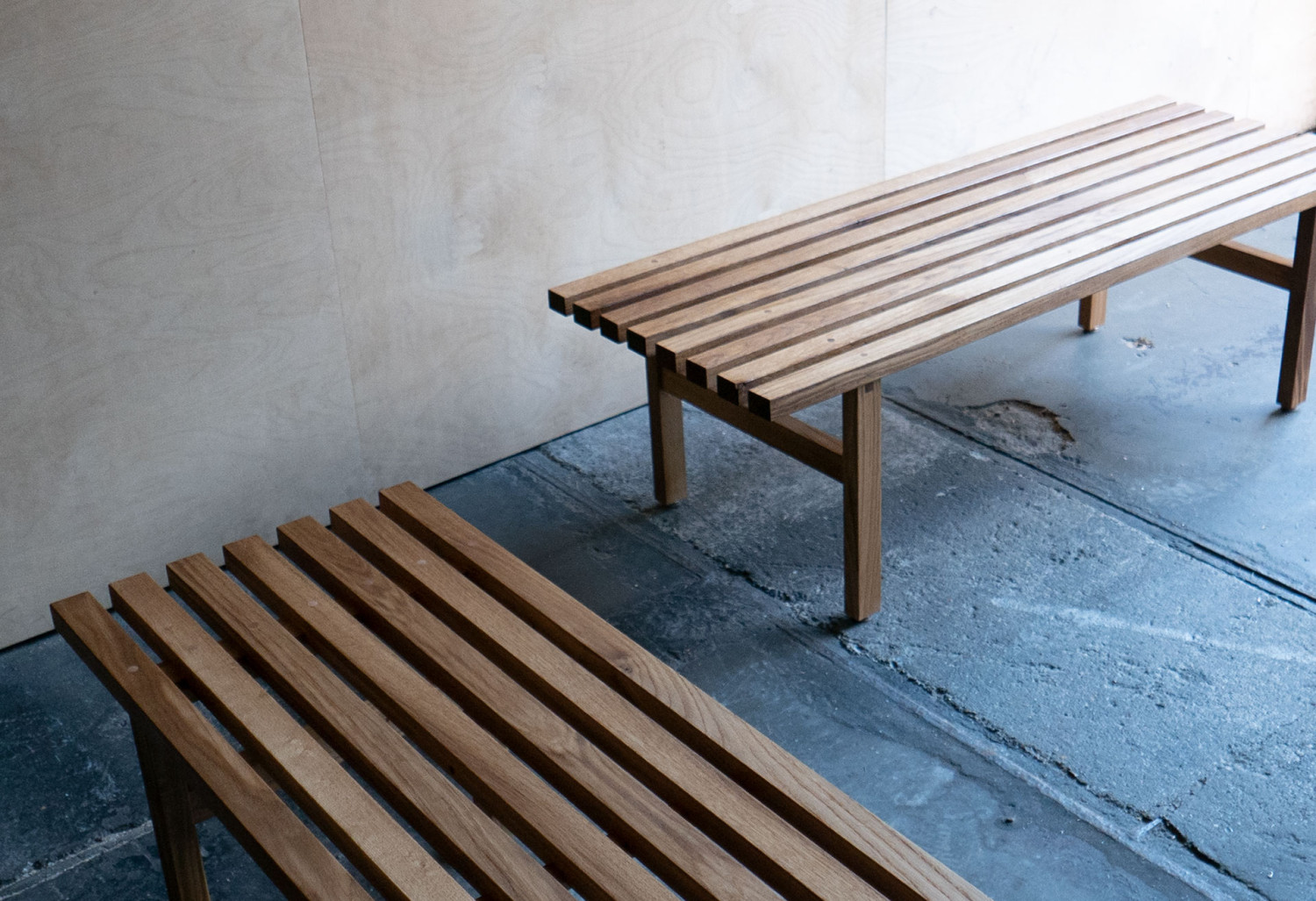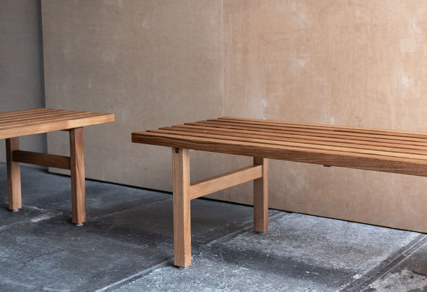 Deze massief eiken latten bankjes heb ik samen met Zip Stolk gemaakt van een oud tafelblad die wij op straat vonden. We waren geïnspireerd door de Oosterse eenvoud. De bankjes zijn afgewerkt met een olie.