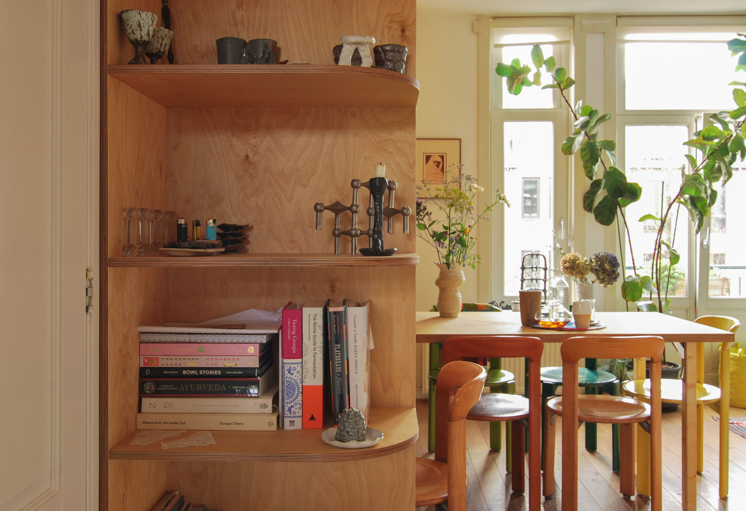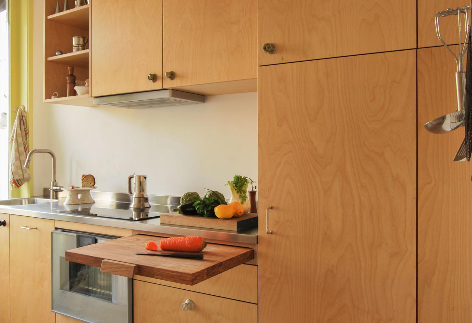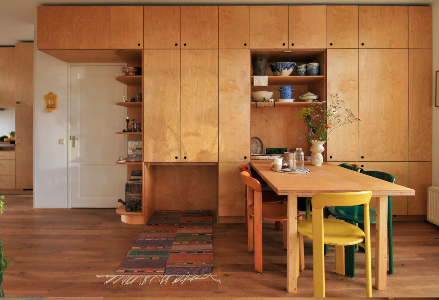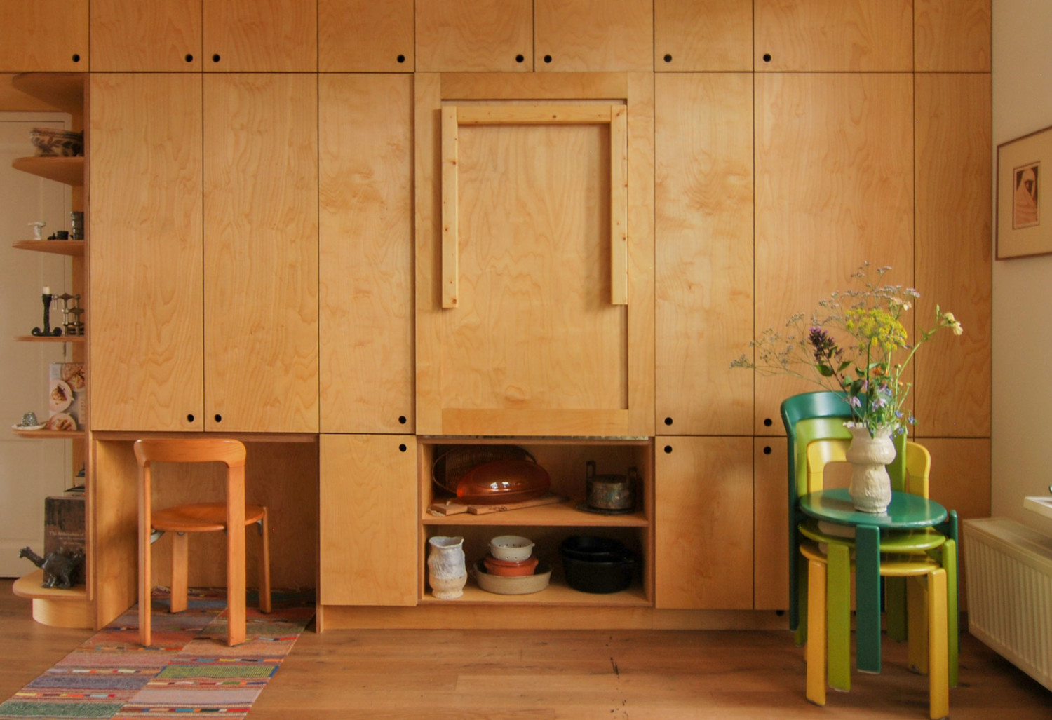 De kast en keuken van berken multiplex heb ik samen met Zip Stolk ontworpen en gemaakt. We hebben de wensen van onze opdrachtgever welke een beperkt woonoppervlak hadden vertaald in een functioneel meubel waar aan gegeven en gewerkt kan worden.