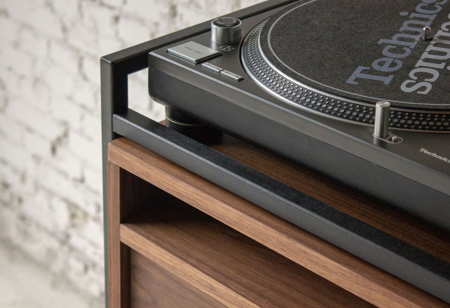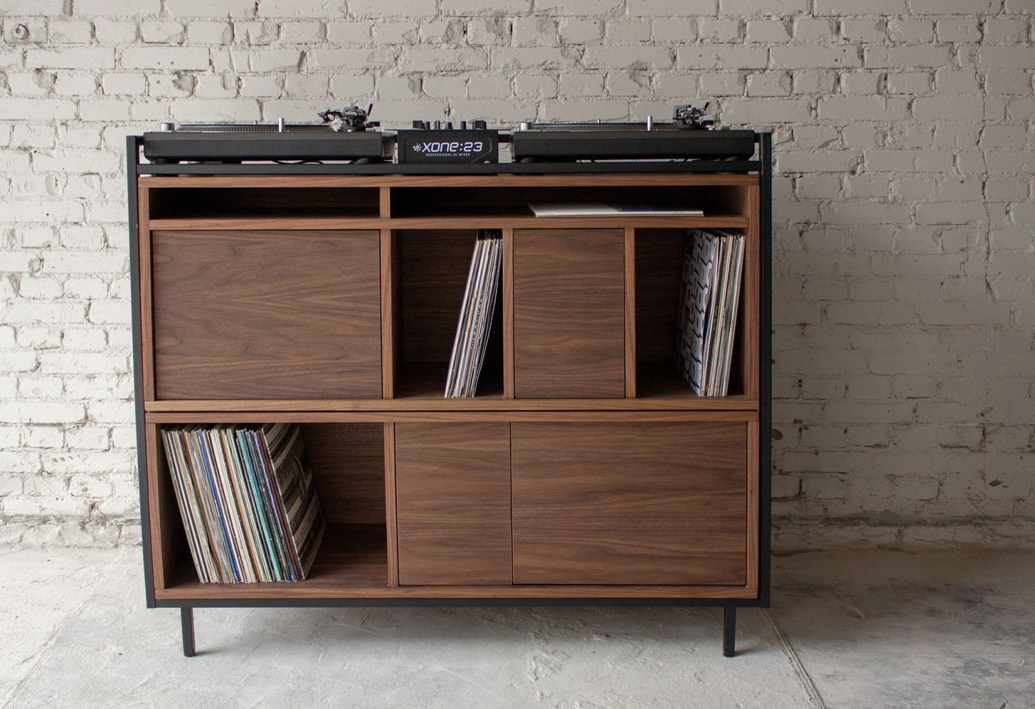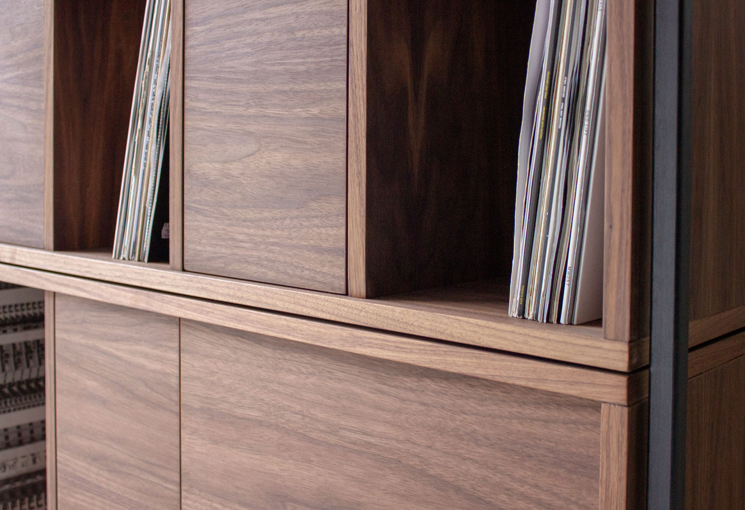 Custom made record booth with a fine walnut veneer finish. Open and closed boxes created a playfull way to store the vinyls. A brush painted steel framing completes and encloses the interplay of lines.
