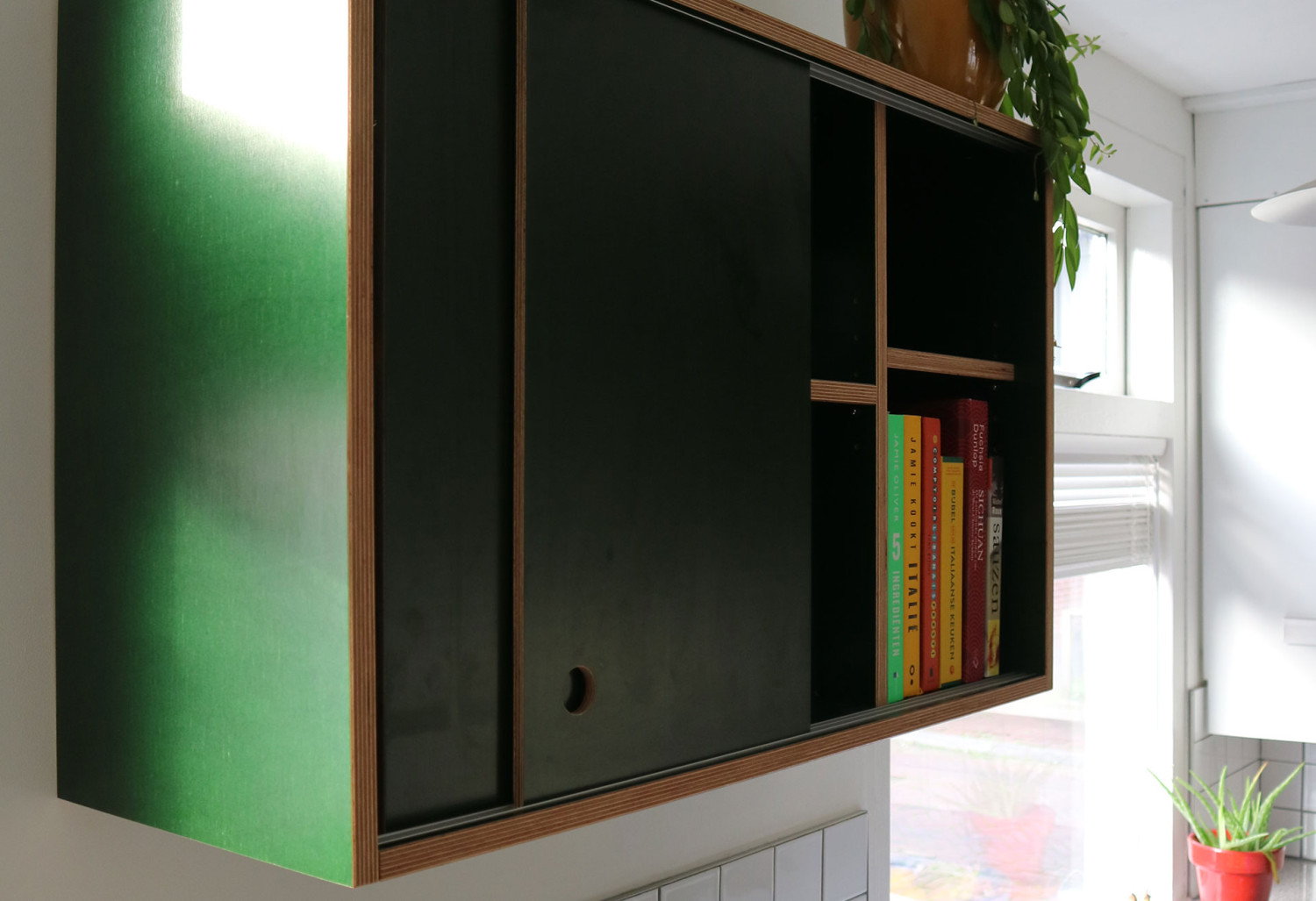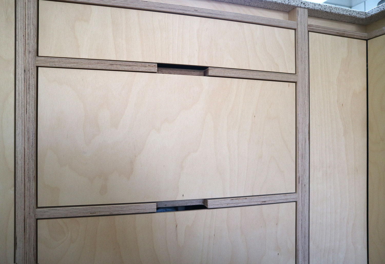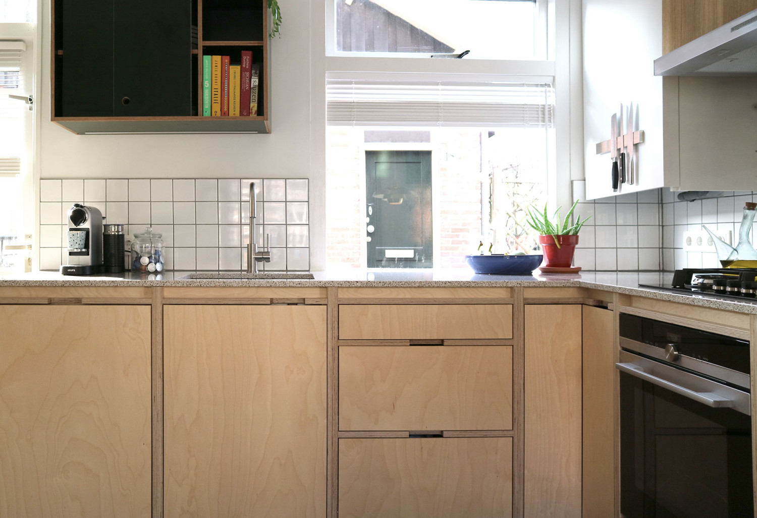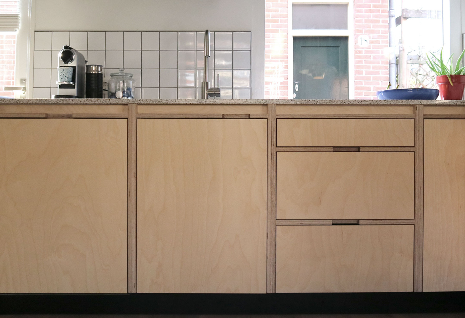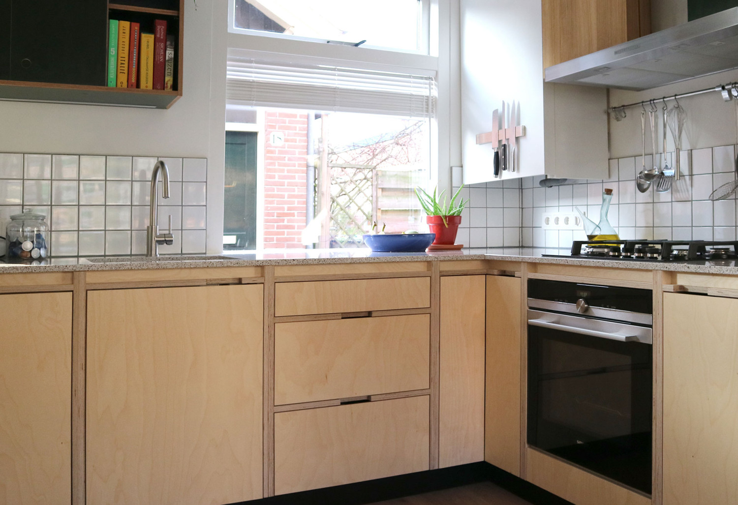 Deze keuken uitgevoerd in een Berken multiplex is volledig op maat ontworpen en gemaakt. De kopse kanten van de onderkasten zijn doorgetrokken zodat deze met elkaar een speels lijnenspel vormen die de keuken zijn karakter geven. De sparingen voor de grepen geeft het beeld extra diepte en contrast. Een doordacht en tegelijk tijdsloos ontwerp geven de keuken warmte en sfeer. De indeling kwam tot stand in overleg met de klant.