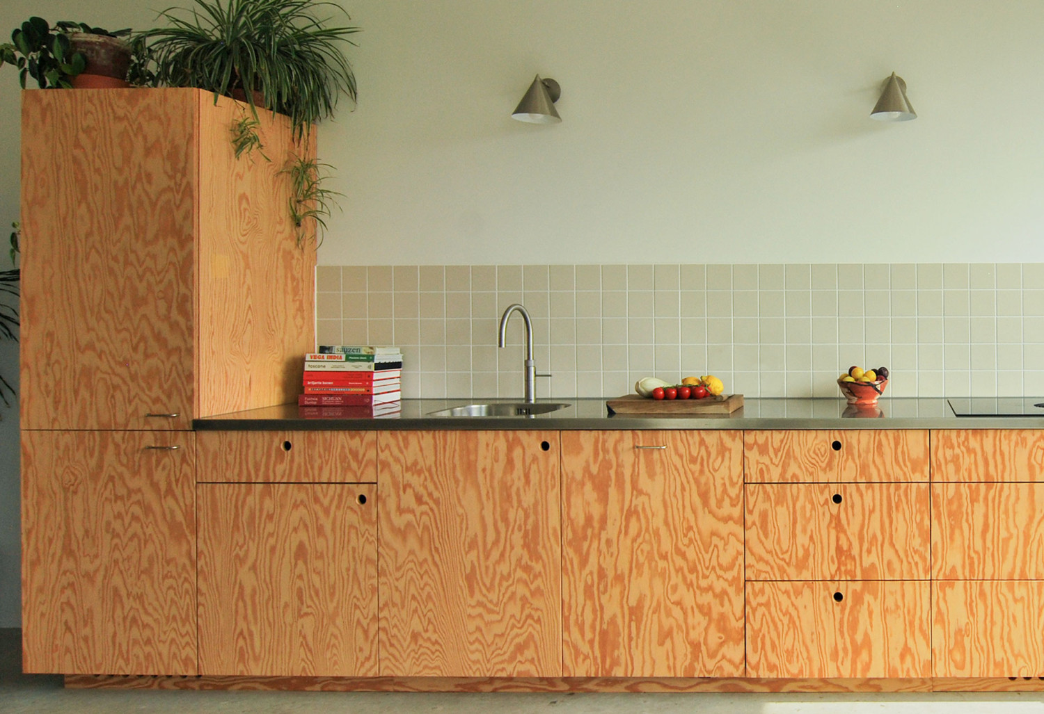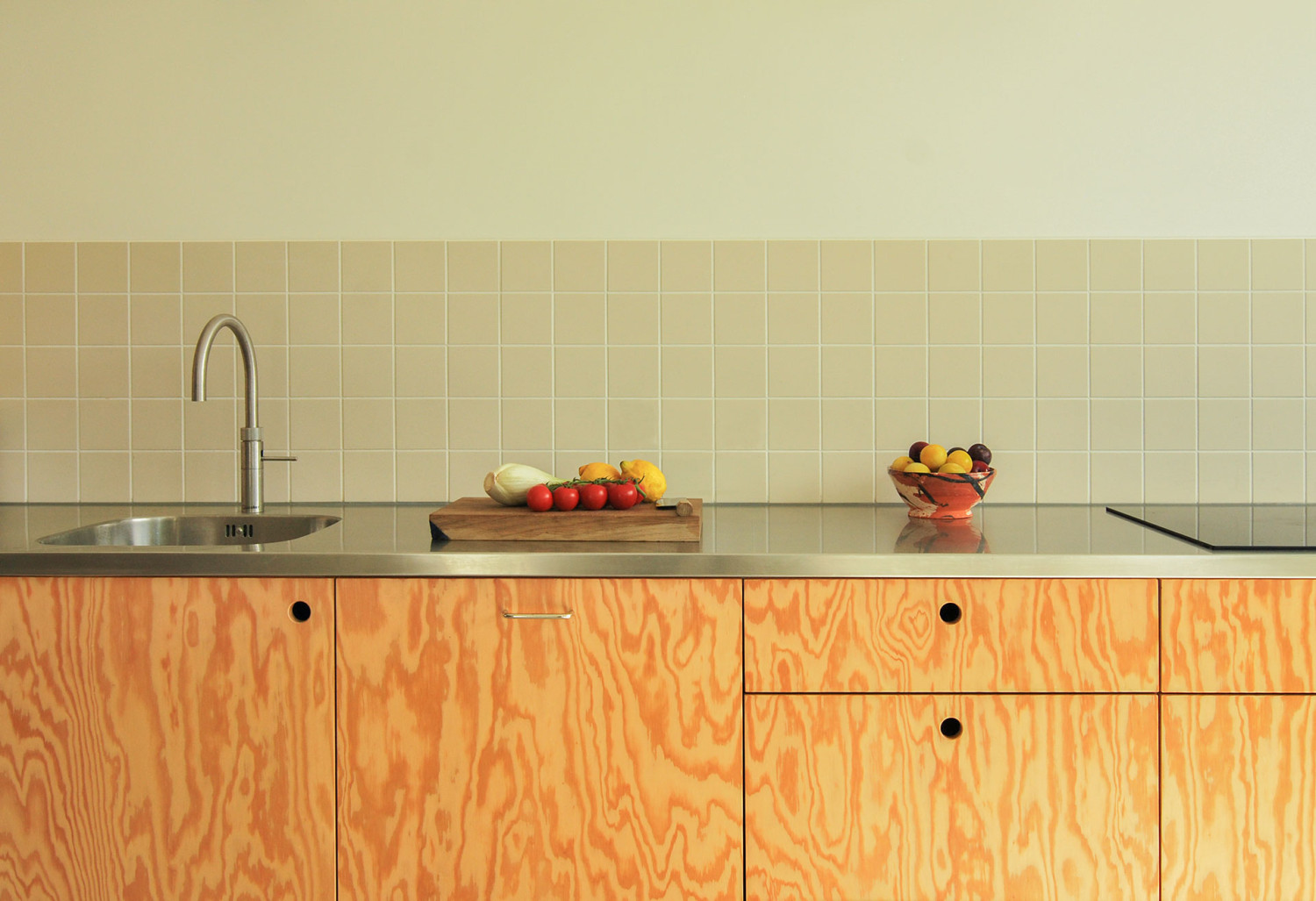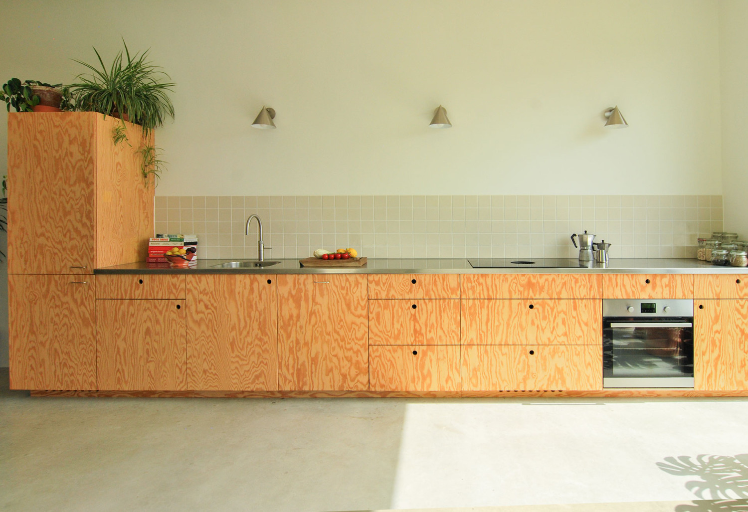 Deze keuken op maat van Pools grenen multiplex en rvs keukenblad heb ik samen met Zip Stolk gemaakt. Het binnenwerk is van gelakt berken multiplex.