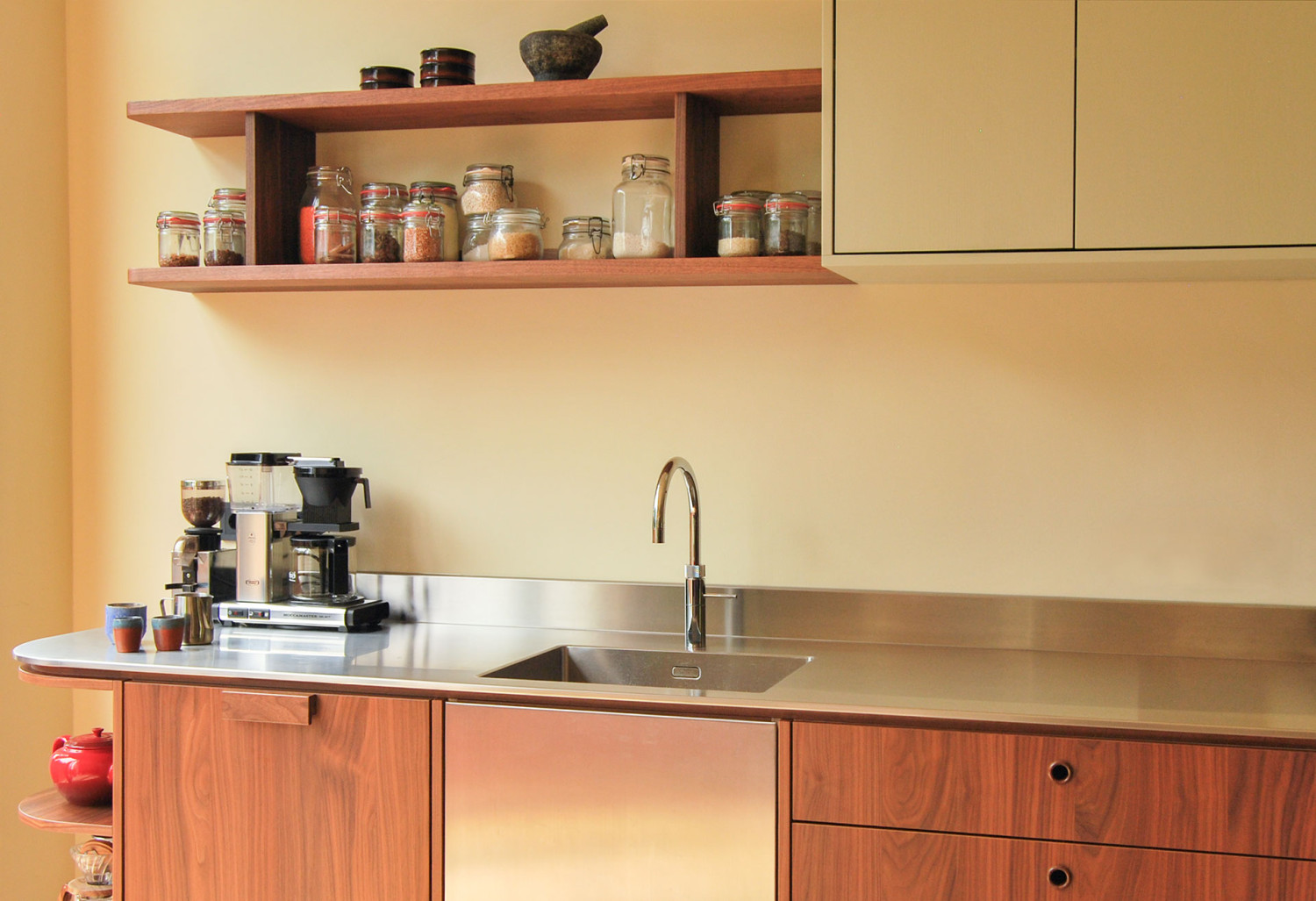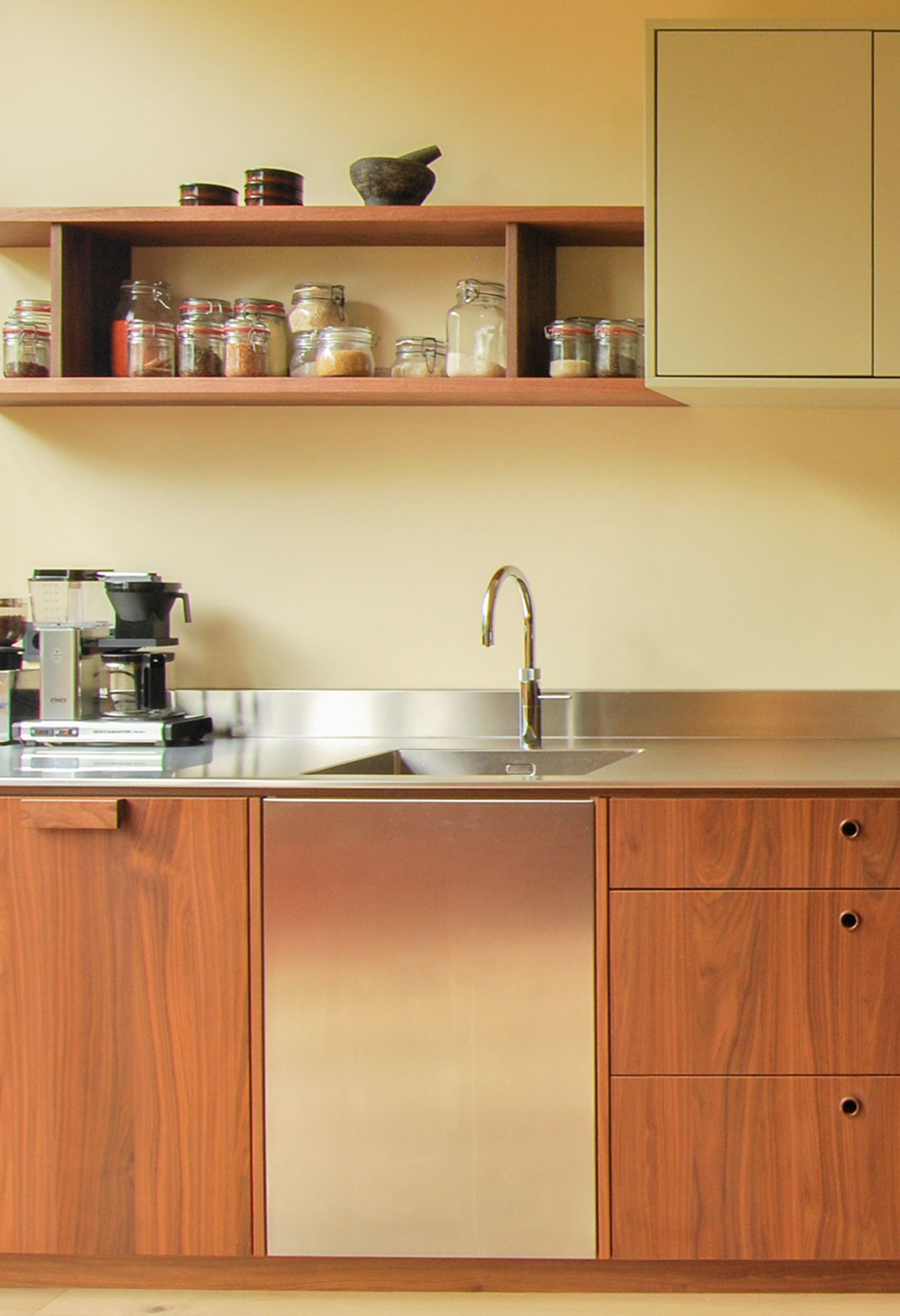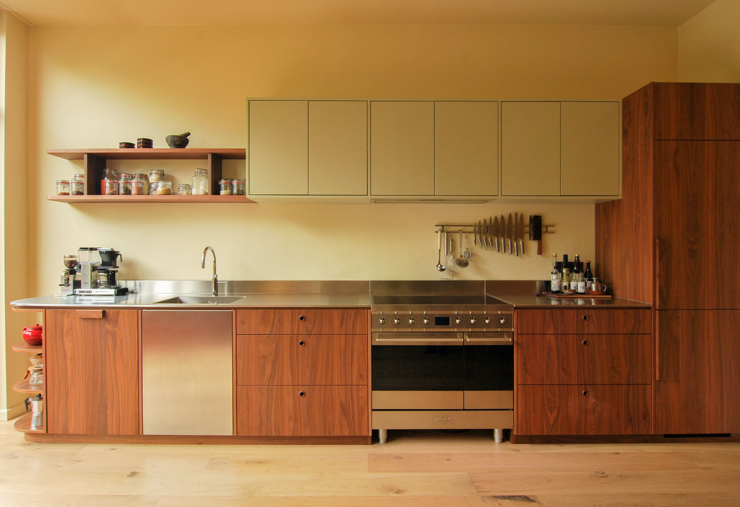Samen met Zip Stolk heb ik deze duurzame en luxe leefkeuken van notenhout mogen ontwerpen en bouwen. Het binnenwerk hebben we gemaakt van een berken betonplex. De laden en het werkblad zijn van RVS met een ingelaste spoelbak. De grepen en open kasten zijn van massief notenhout.
