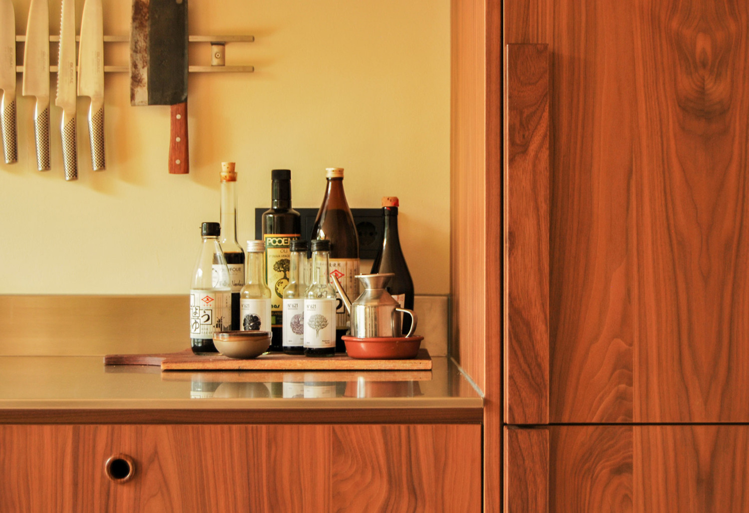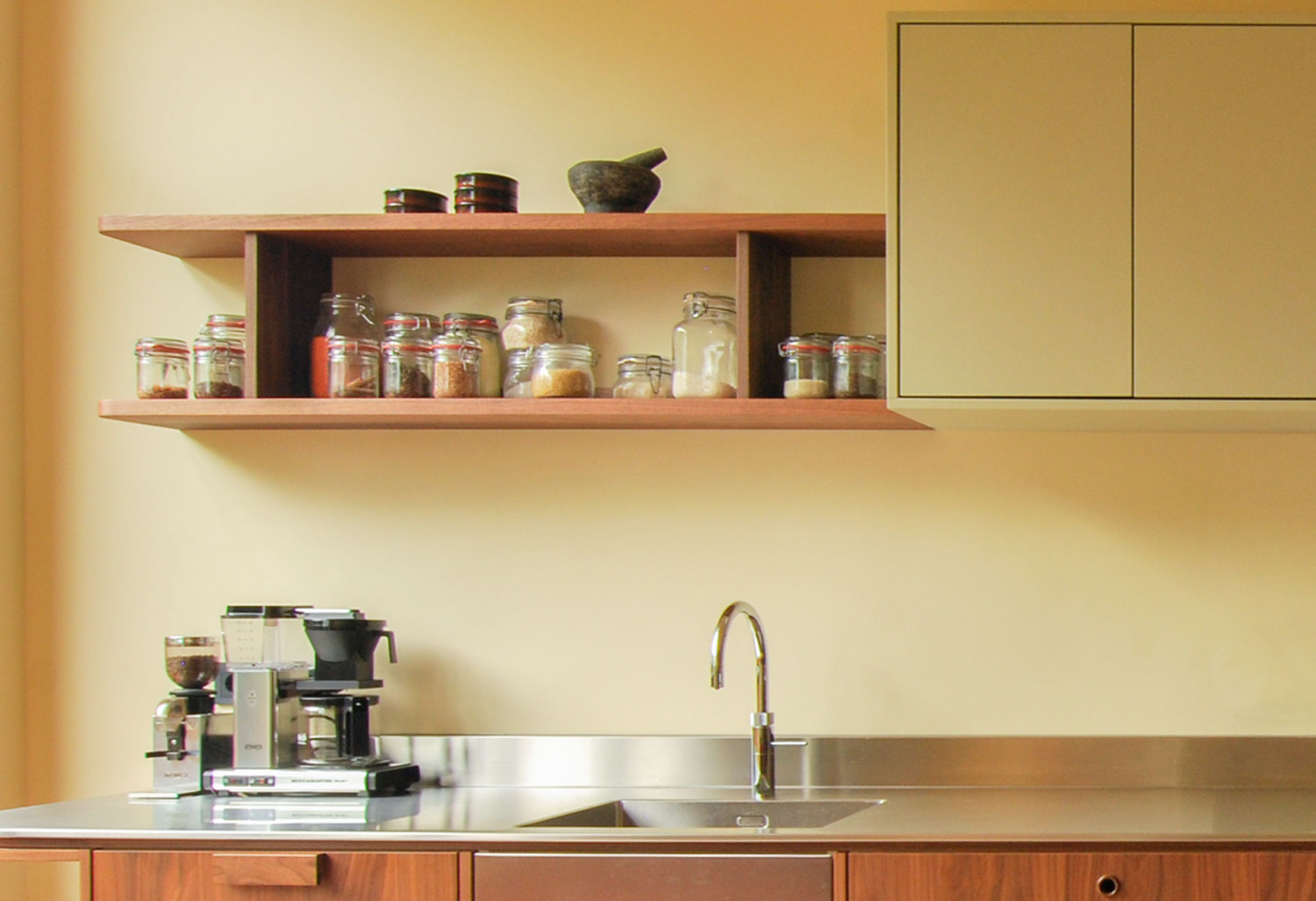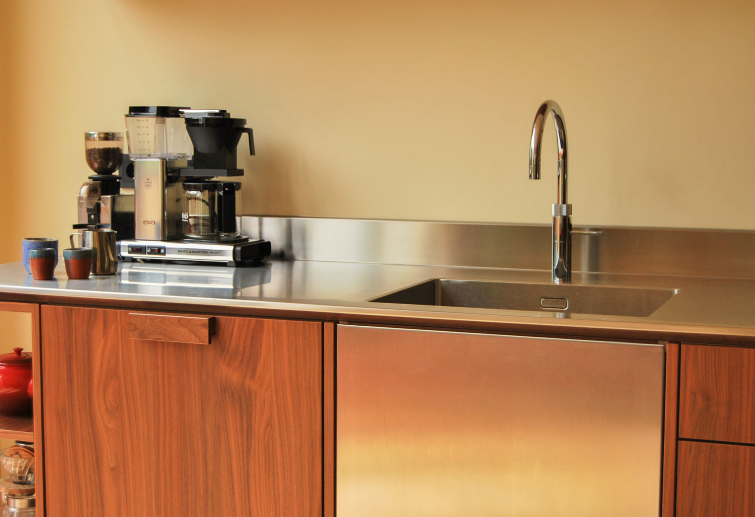 Samen met Zip Stolk heb ik deze duurzame en luxe leefkeuken van notenhout mogen ontwerpen en bouwen. Het binnenwerk hebben we gemaakt van een berken betonplex. De laden en het werkblad zijn van RVS met een ingelaste spoelbak. De grepen en open kasten zijn van massief notenhout.