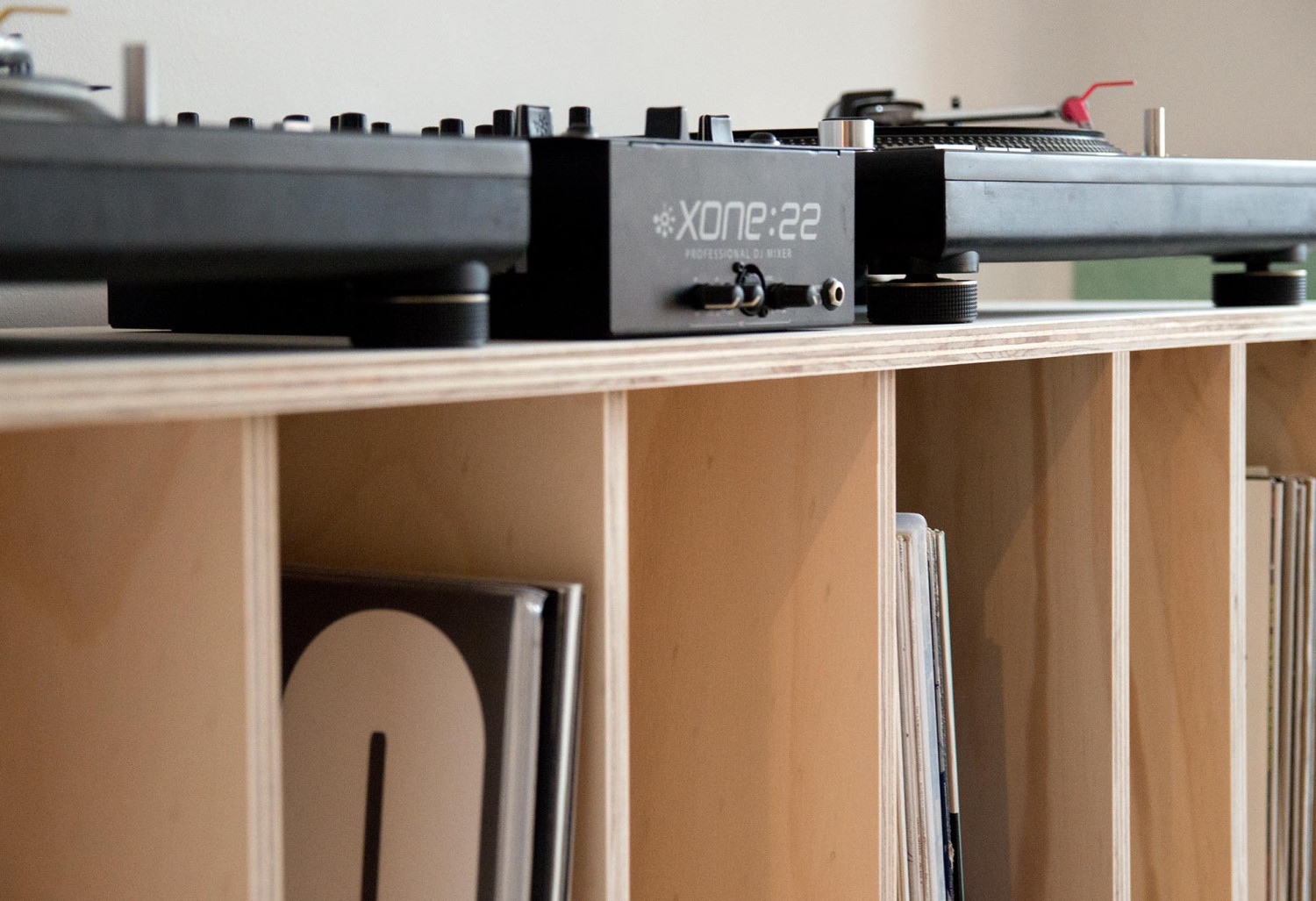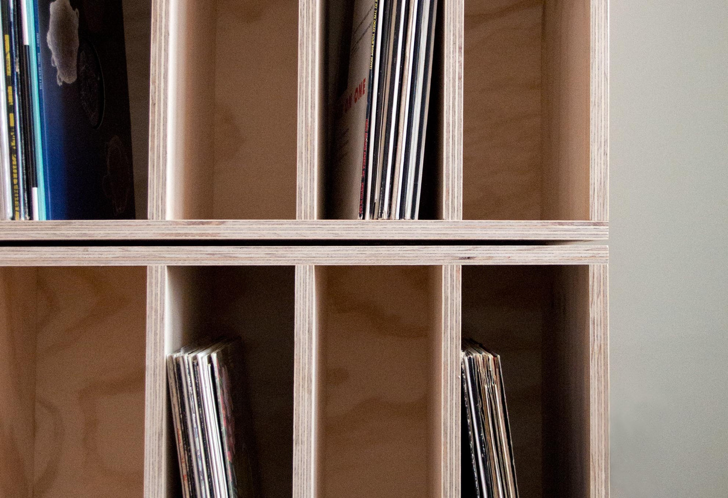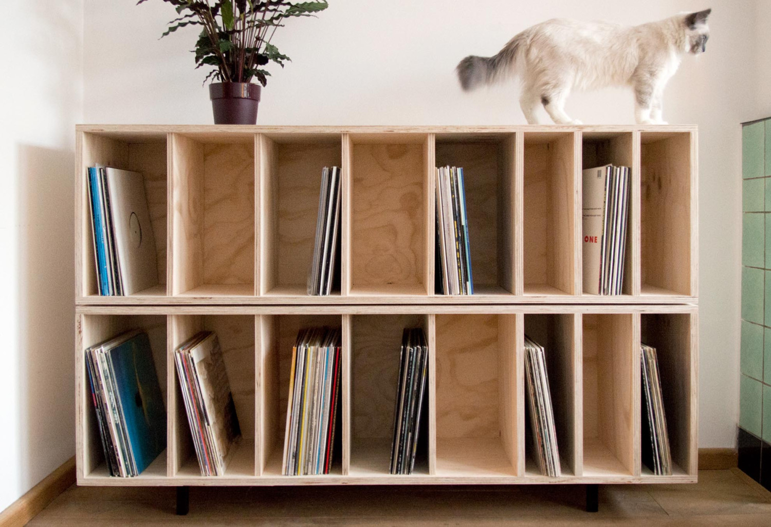 Simpel en functioneel. Deze platenkast van een Radiata Pine multiplex die ook te gebruiken is als DJ-Booth. De afmetingen en vakverdeling van dit ontwerp kunnen worden aangepast naar wens.