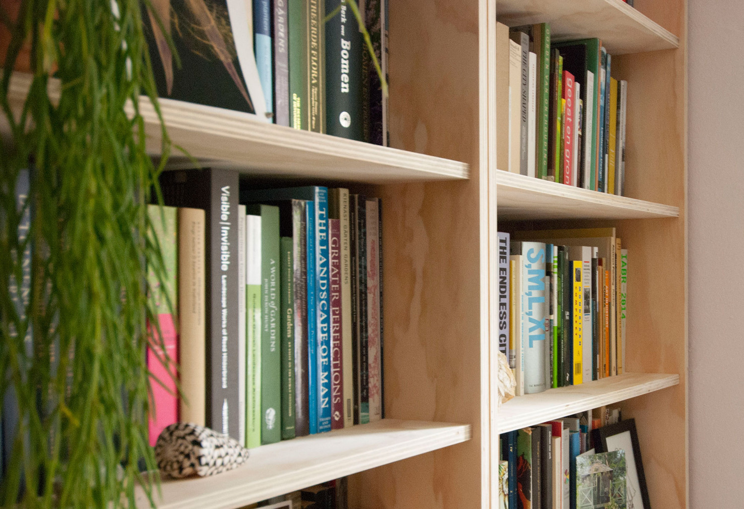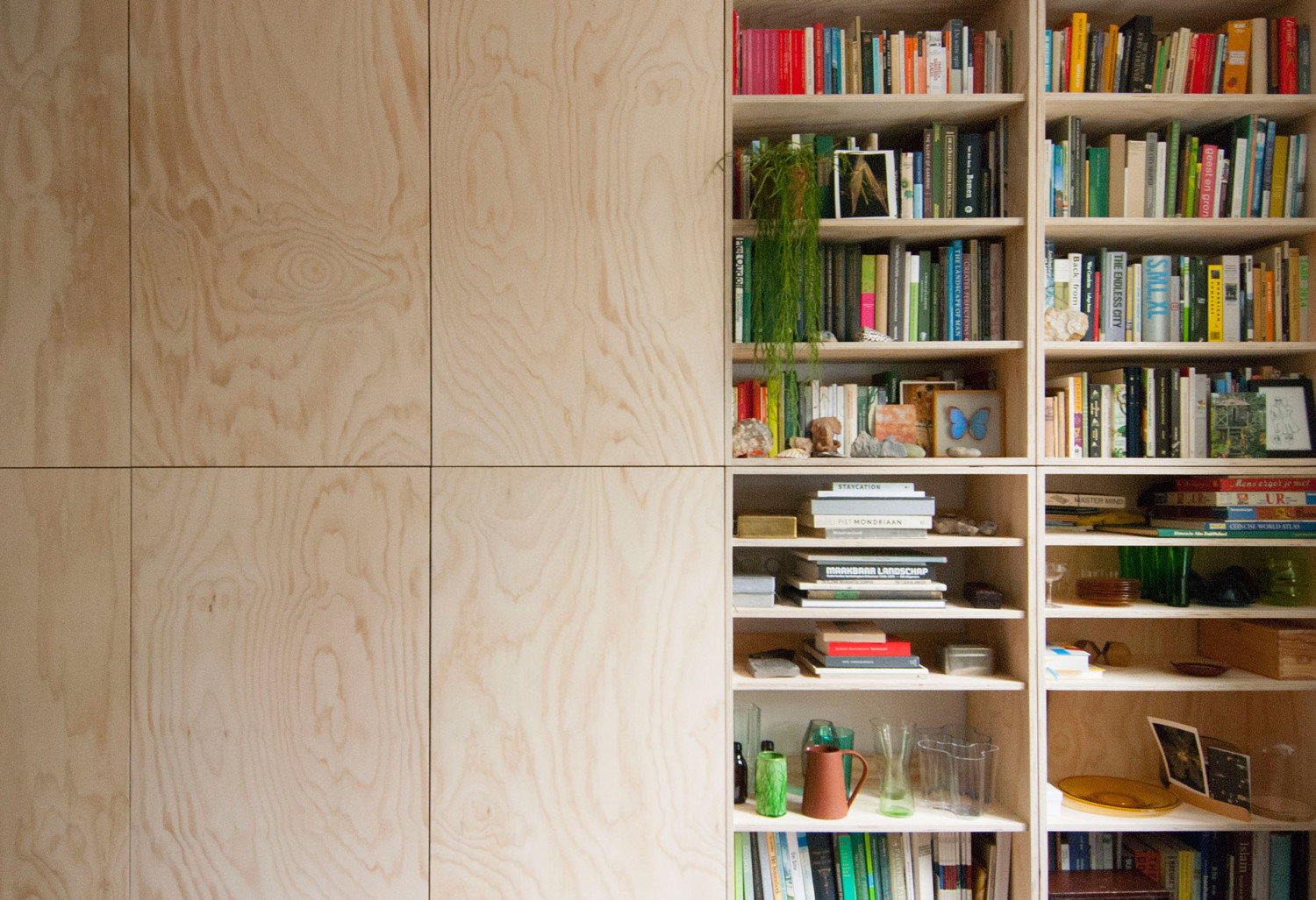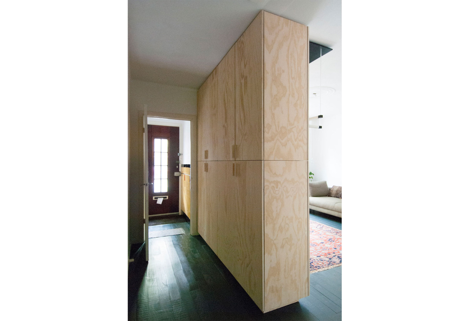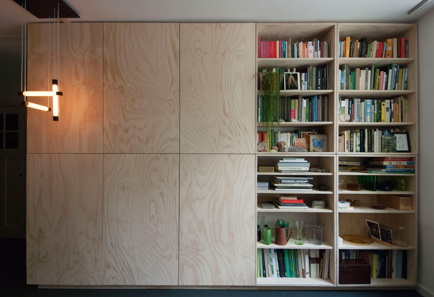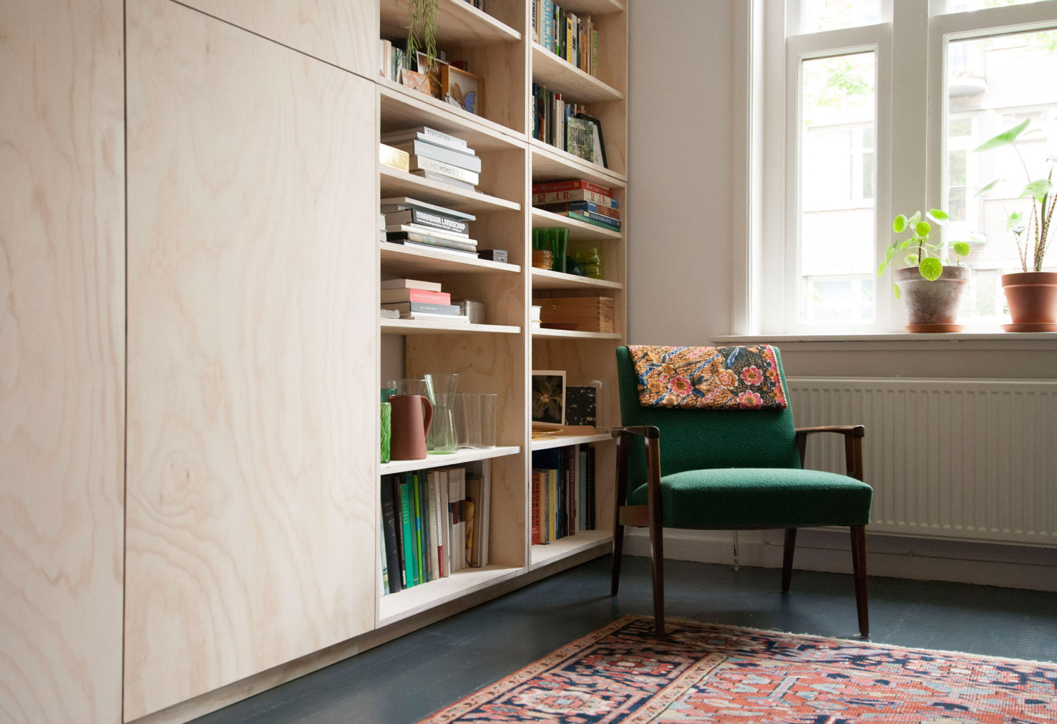De room divider heeft van één ruimte twee ruimtes gemaakt. Dit meubelwerk op maat was een idee van de opdrachtgever. Samen hebben we bekeken hoe we dit het beste konden uitvoeren. Aan de zijde van de hal is een hoop bergruimte gerealiseerd. In de woonkamer geven de boekenkast en het hout sfeer aan de ruimte.